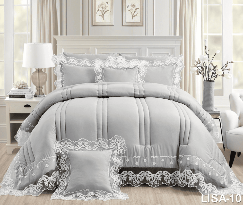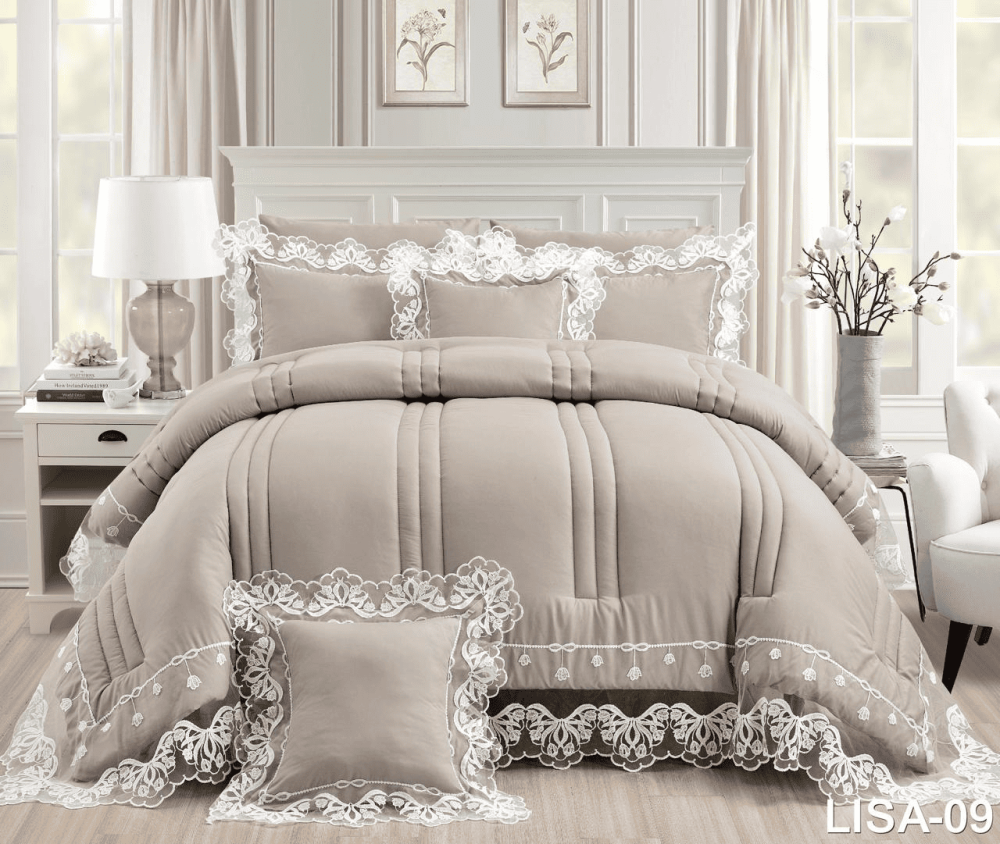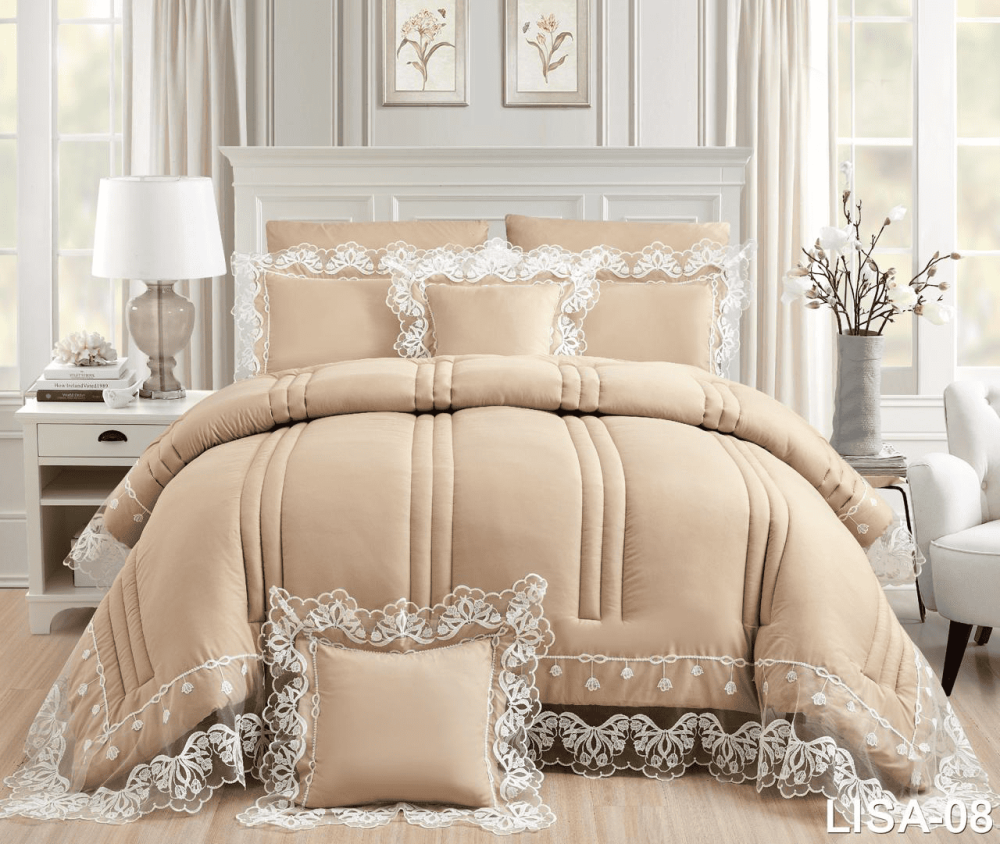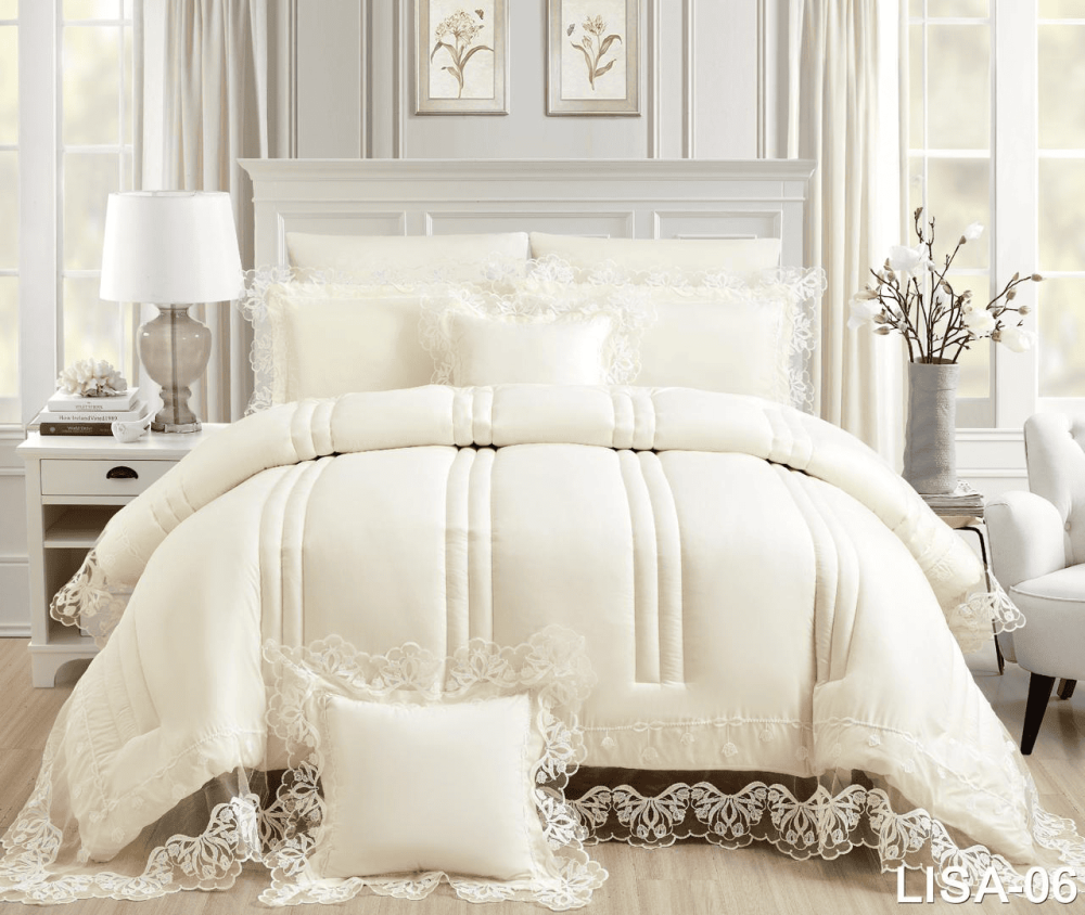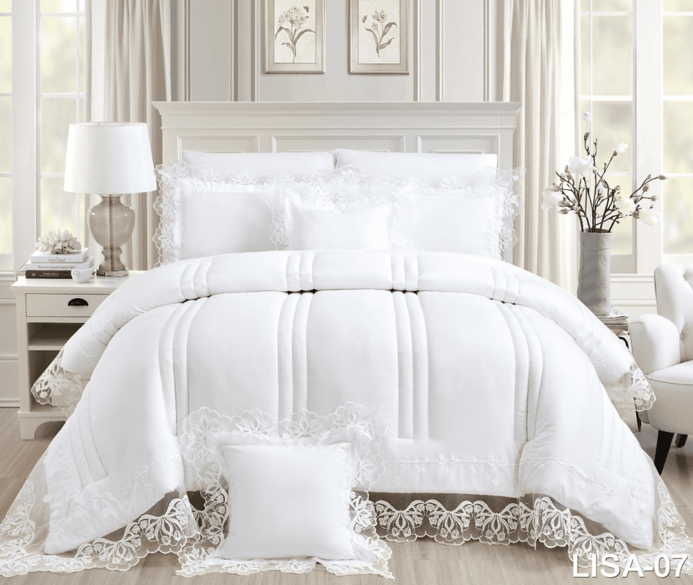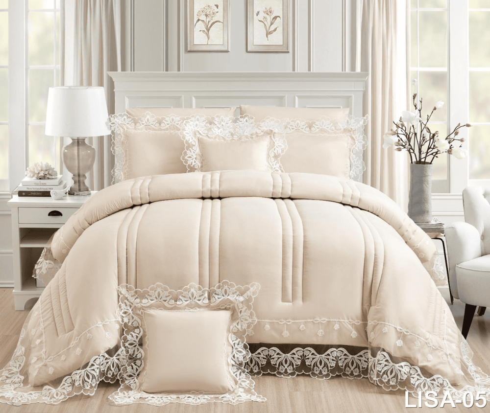 ٨ قطع متكاملة، تشمل: مفرش فندقي نفرين ، لحاف، مفارش، مخدات، وكفرات بطابع فندقي أنيق. ملمس ناعم وجودة عالية تعطيك إحساس مفرش سرير فندقي مميز، ينعّم نومك كل ليلة. خامة عملية وتتحمل الغسيل، وتعيش معك لفترة طويلة بدون ما تبهت. مثالي للي يحبون مفرش دانتيل أو يبغون يزينون الغرفة بـ مفرش سرير دانتيل يضيف لمسة نعومة وأناقة.