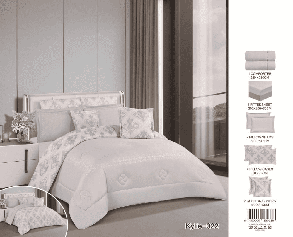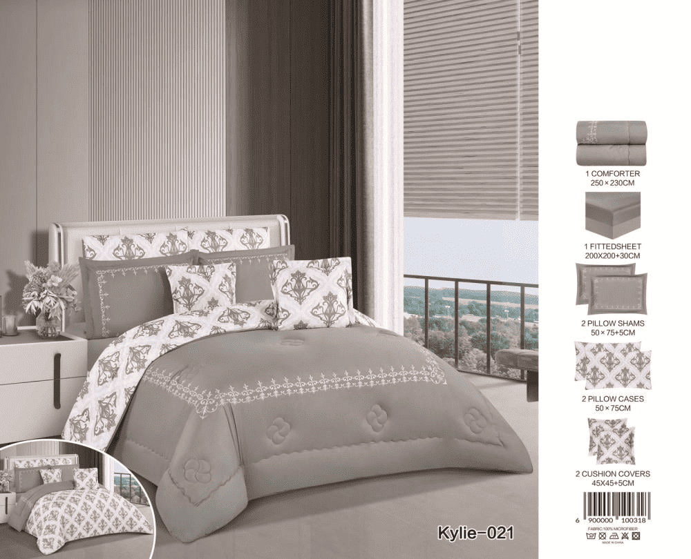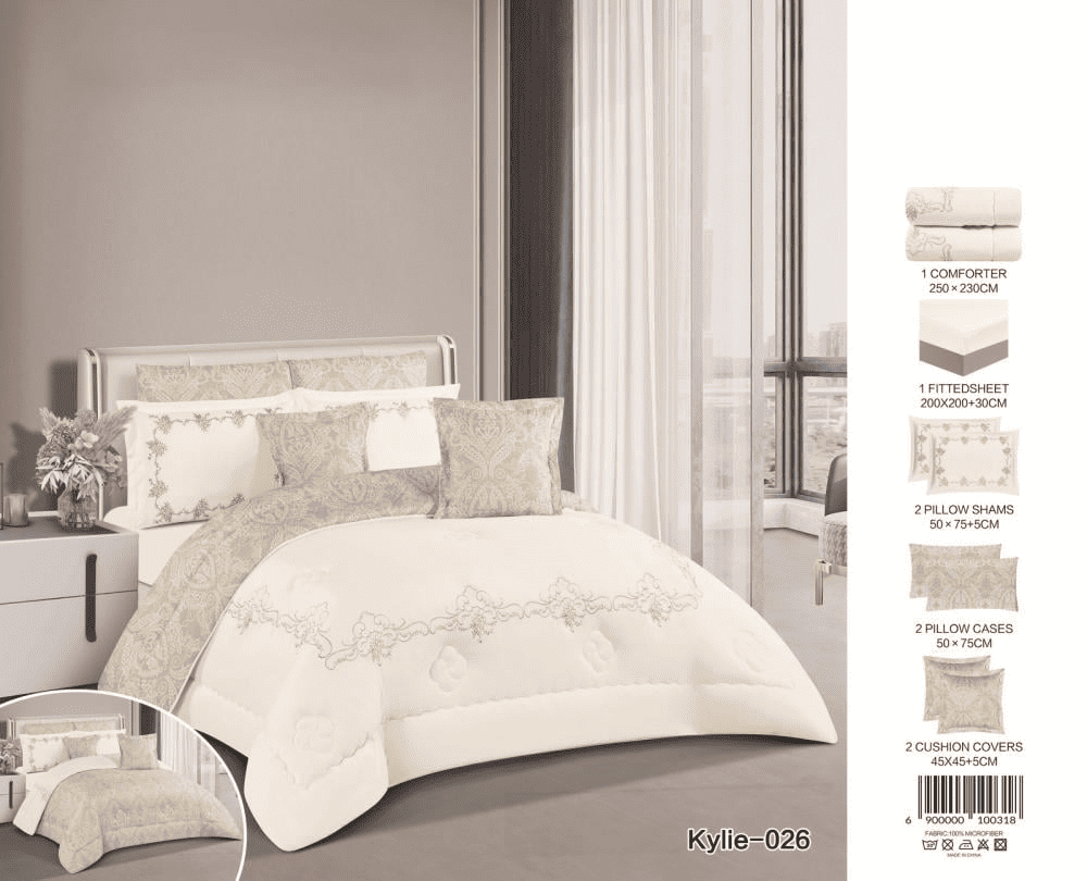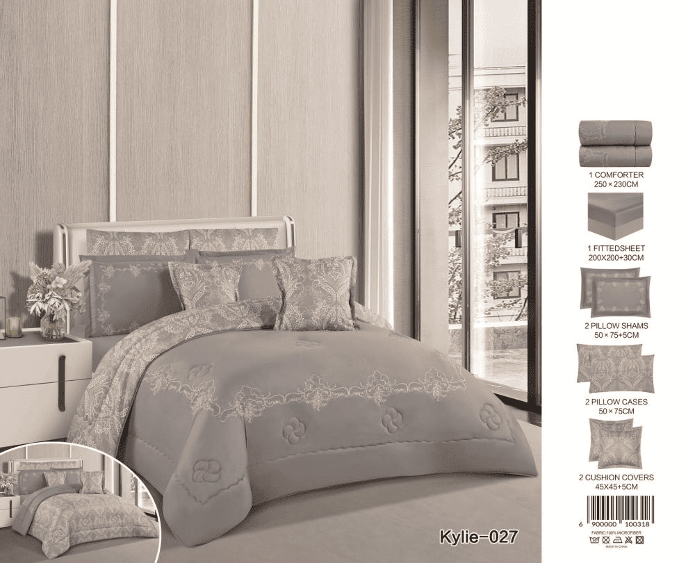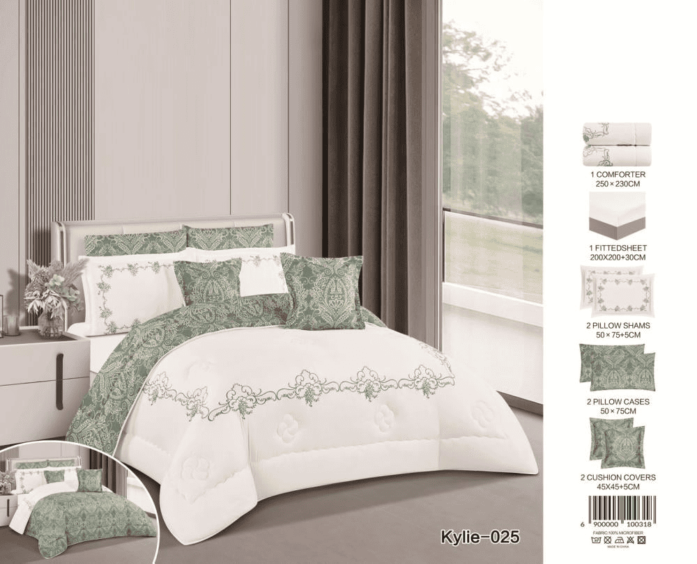 • 1 لحاف 250×230، 1 شرشف مطاط 200×200×30، 4 كيس مخدة كبير، 2 مخدة مربعة
