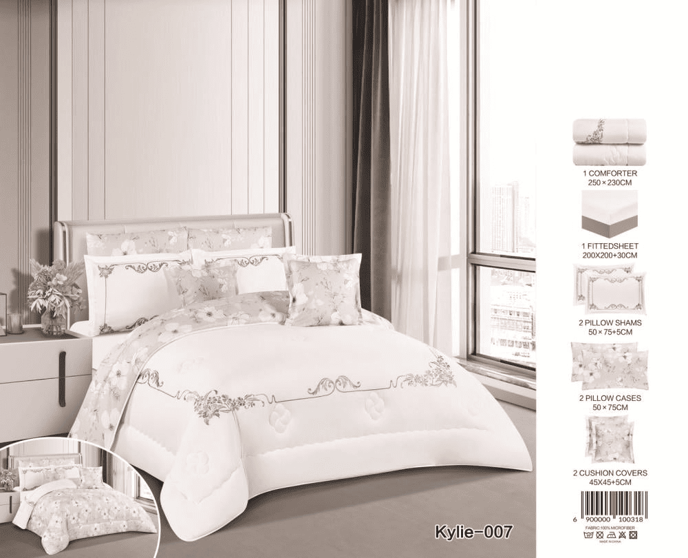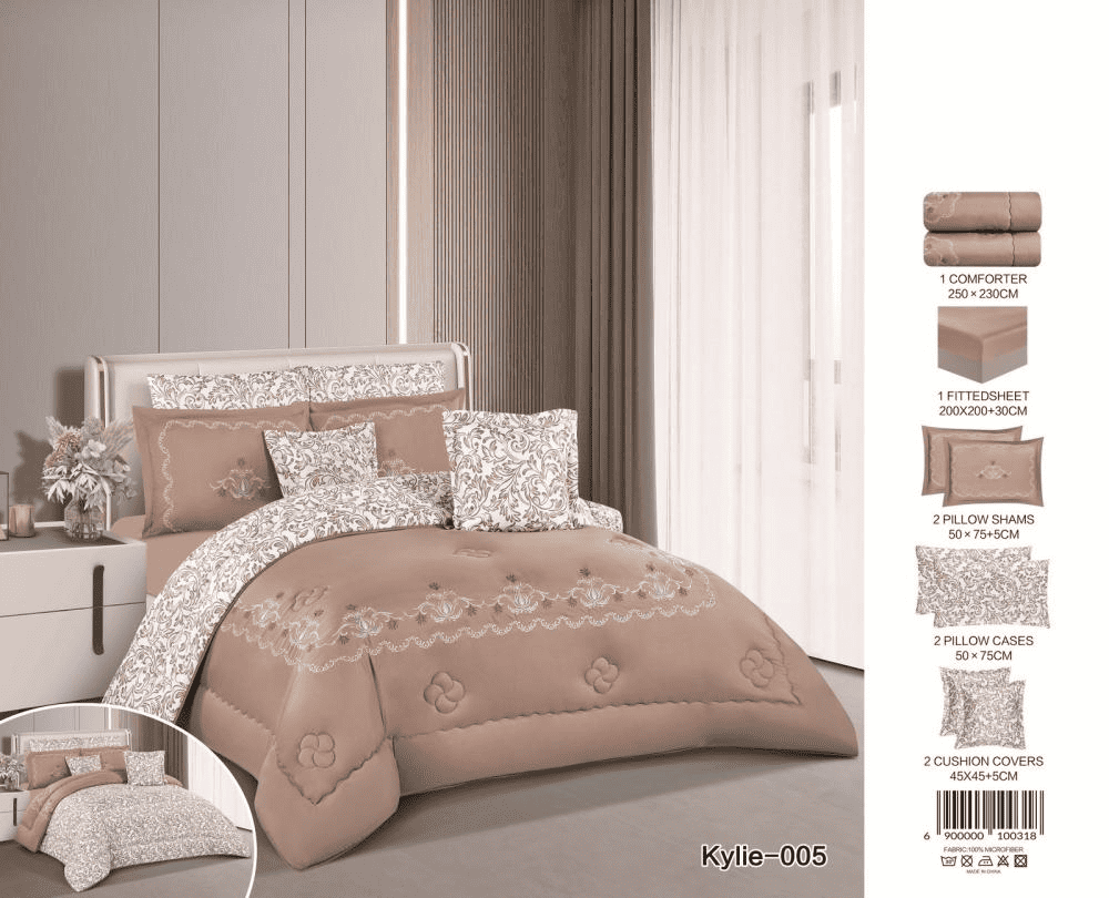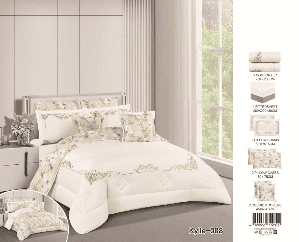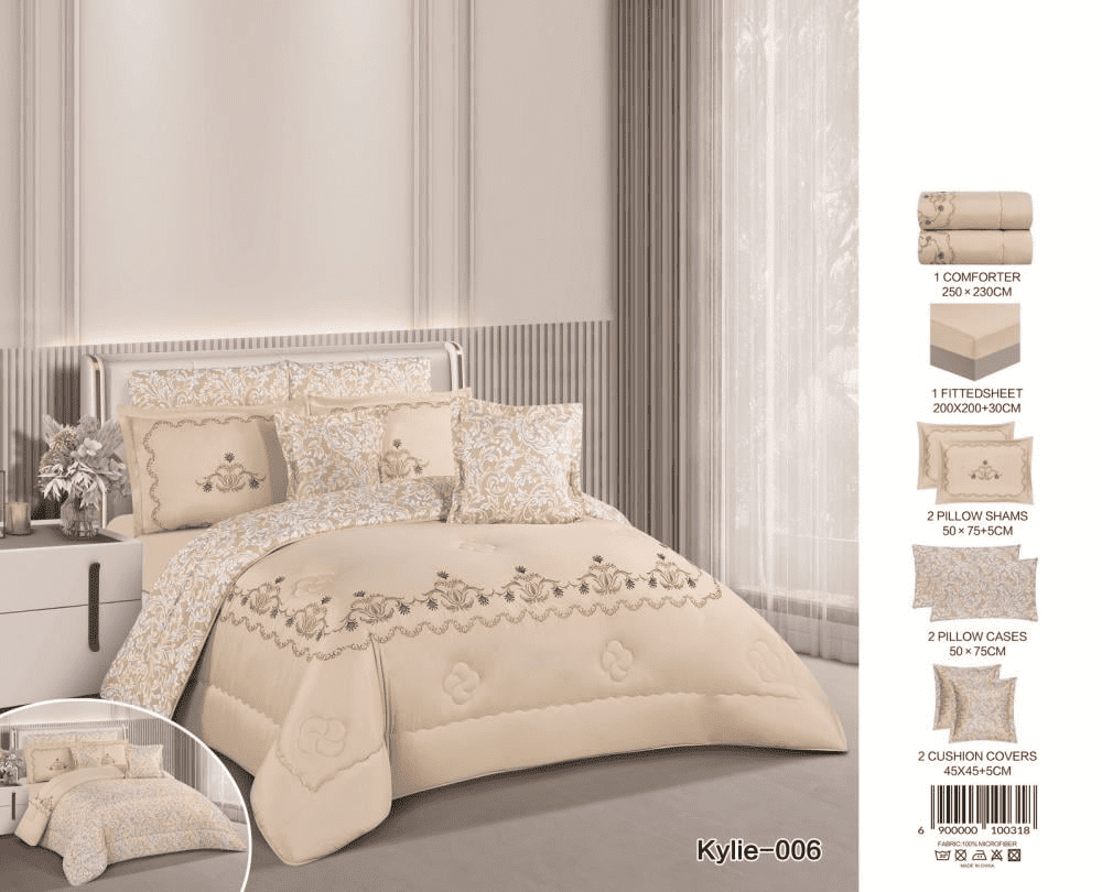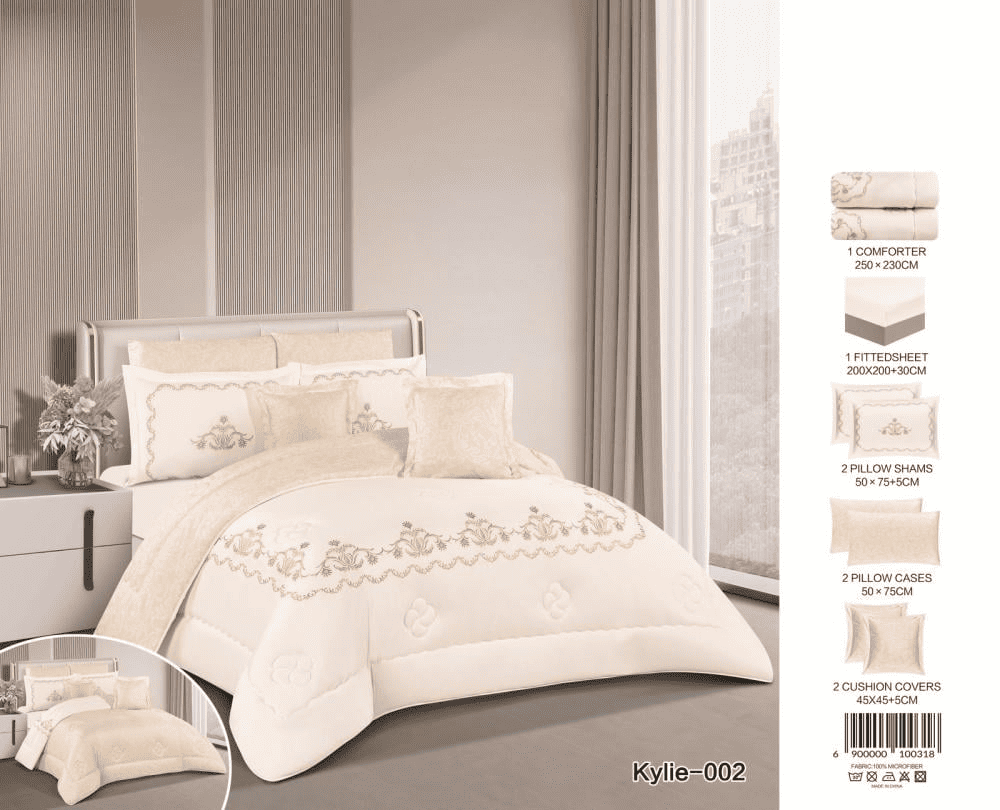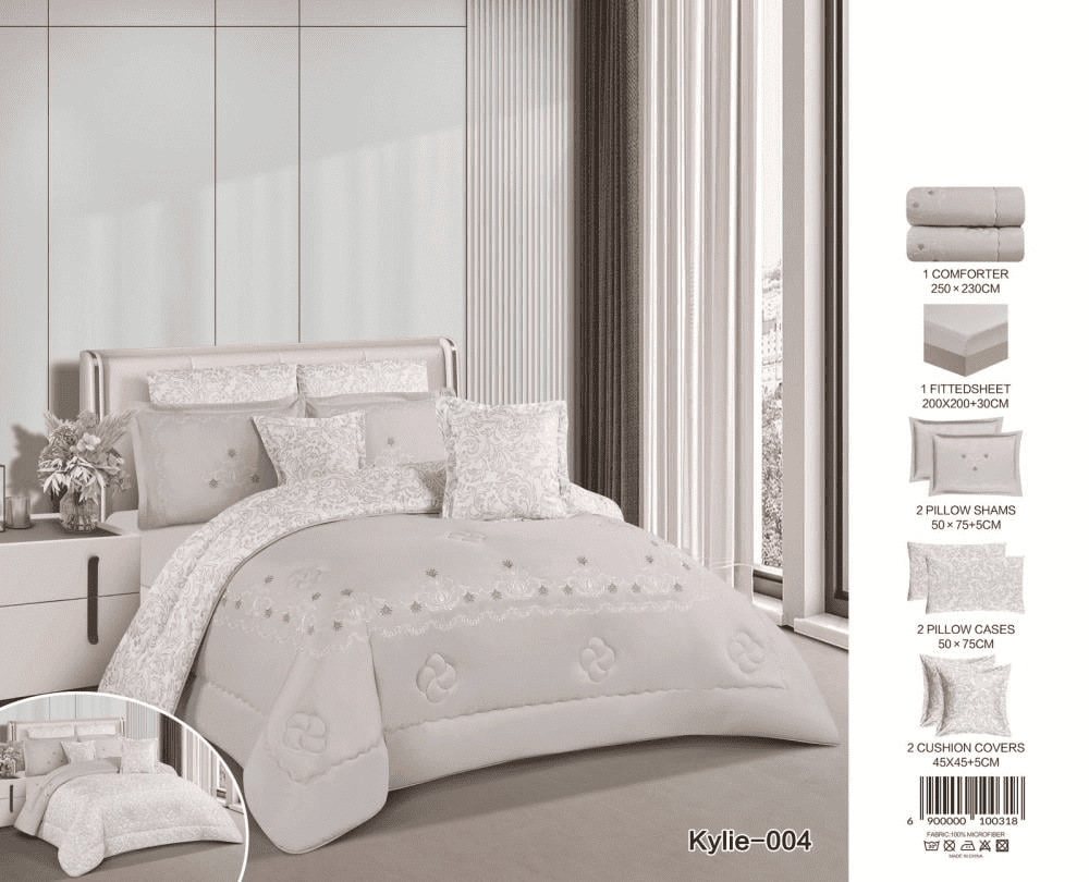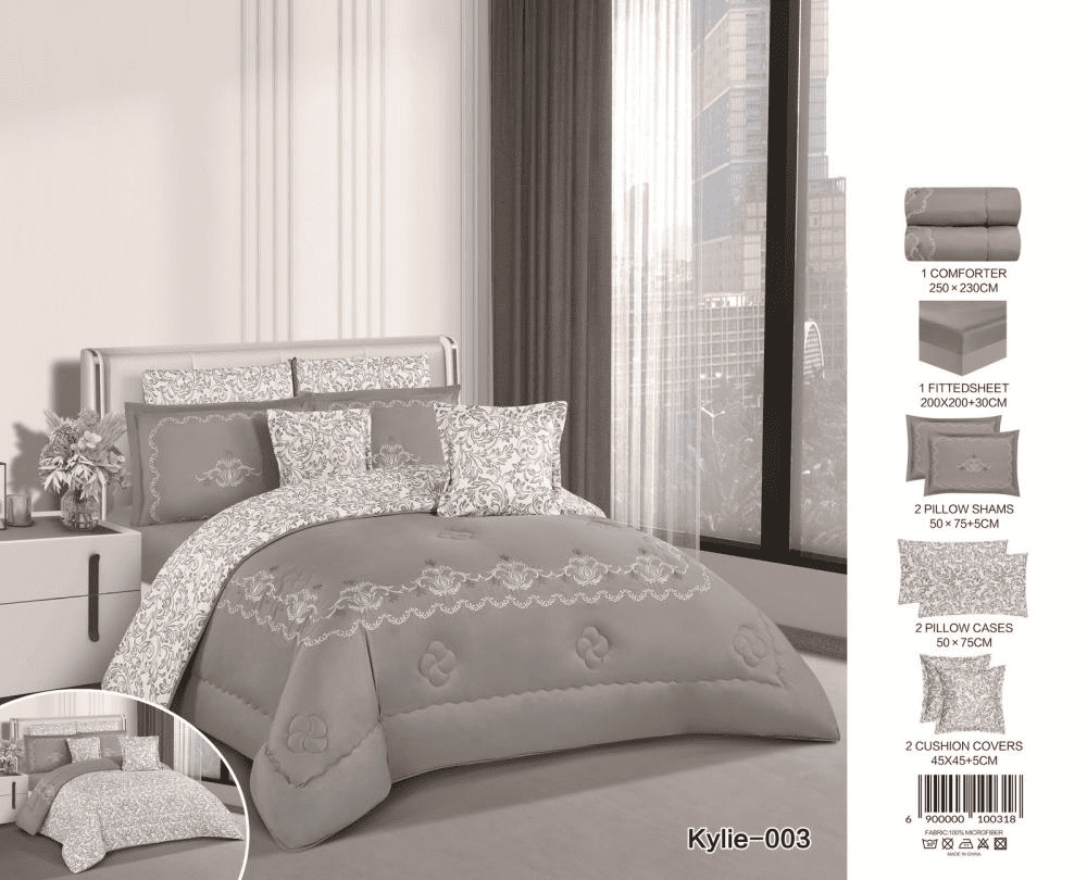 Shams Home يقدم لك 03 مفرش كايلي مطرز عرائسي ٨ قطع ، تصميم ناعم يناسب ذوق العرايس ويكمّل أناقة غرف المودرن. يعتبر من أجمل مفارش العرايس المصممة بعناية وتفاصيل تطريز راقية.
