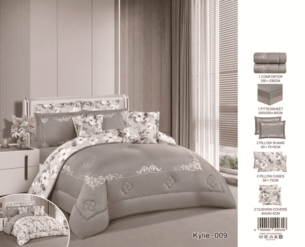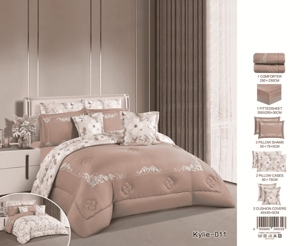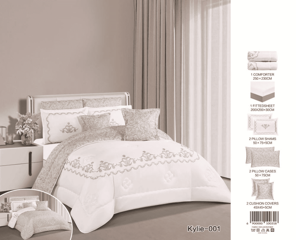 • 1 لحاف 250×230، 1 شرشف مطاط 200×200×30، 4 كيس مخدة كبير، 2 مخدة مربعة